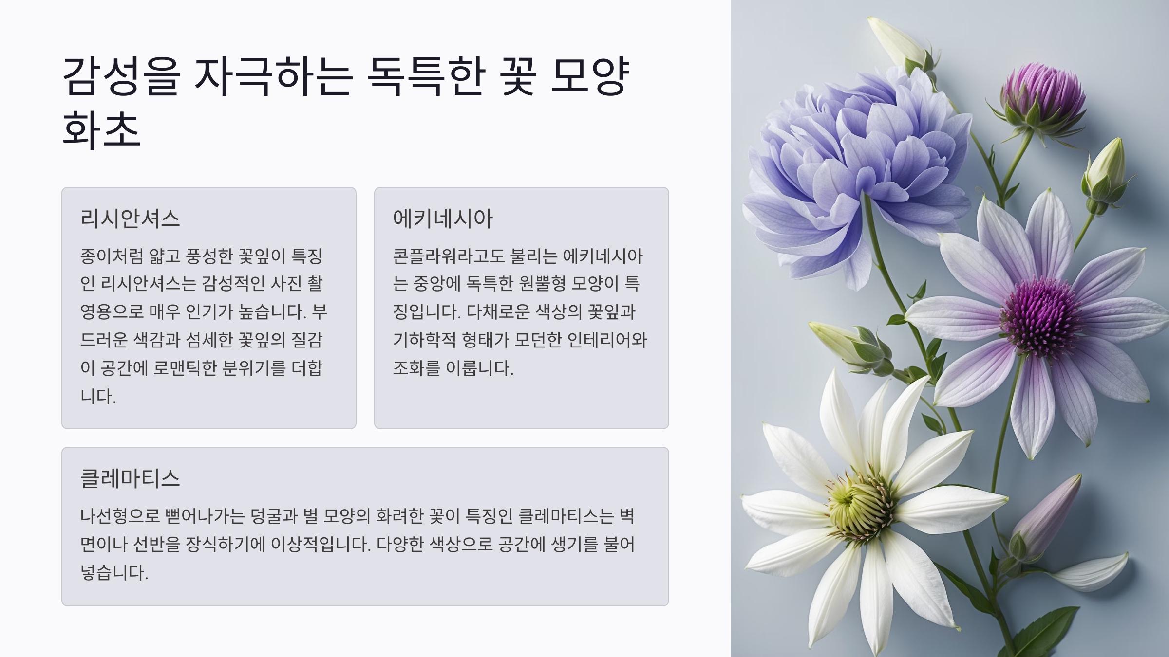 꽃은 그 자체로 예술이지만, 특히 독특한 모양을 가진 꽃은 보는 사람의 감성을 자극하는 특별한 힘이 있어요. 평범한 하루에 포인트를 주고, 시선을 단번에 사로잡는 꽃들은 여성들의 감성에 꼭 맞는 선택이죠.