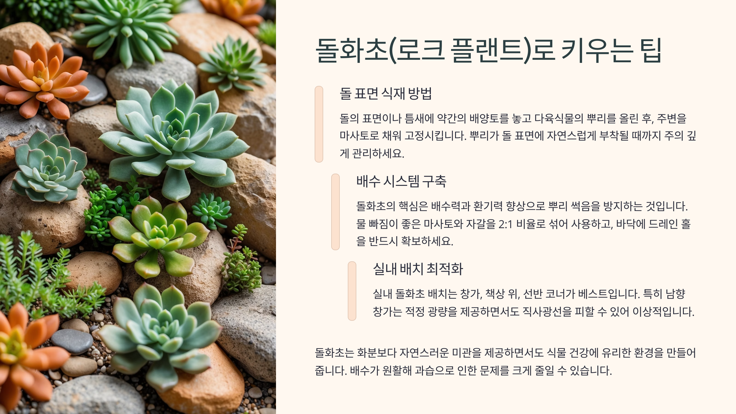 돌화초는 너무 자주 물을 주면 오히려 터질 수 있으니 ‘방치’하는 마음으로 기르는 게 중요해요. 일정 기간 완전한 금수를 견디는 게 건강 관리 비결이죠.