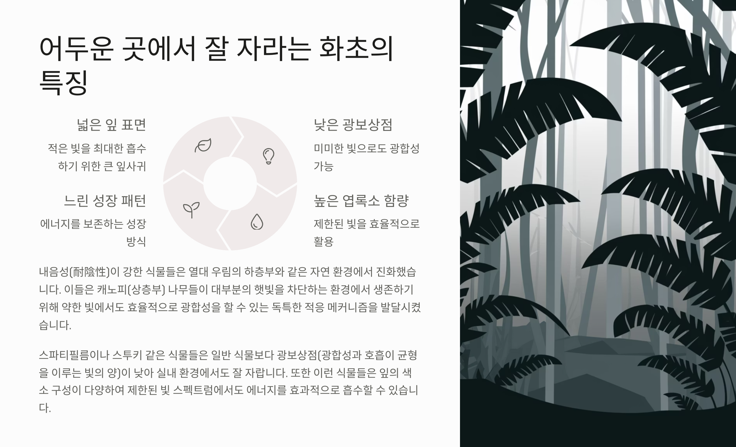 이런 식물들은 광합성 효율이 낮아도 스스로 광포집 능력을 높이는 구조를 가지고 있어서, 약한 조명에서도 생장이 가능해요. 그래서 LED 스탠드 하나만 있어도 반그늘 환경을 만들 수 있어요. 😎