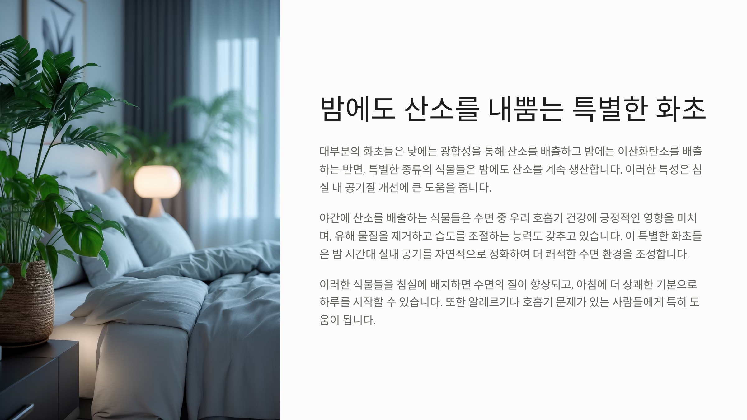 침실은 하루 중 가장 오랜 시간을 보내는 공간이에요. 그래서 쾌적한 공기와 안정적인 분위기를 유지하는 게 정말 중요하죠. 그 역할을 톡톡히 해주는 게 바로 '야간 산소 배출' 식물이에요. CAM 식물 중에서도 침실 환경에 딱 맞는 종류들이 꽤 많답니다. 🛏️