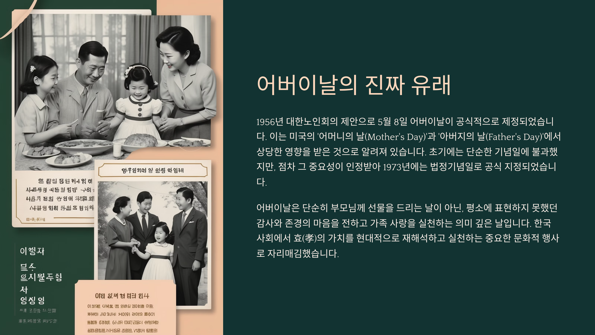 미국의 '어머니의 날(Mother’s Day)' 문화가 한국에 전해진 것이 큰 영향을 줬어요. 20세기 초, 미국에서는 안나 자비스라는 여성이 어머니를 추모하기 위해 운동을 시작했고, 그것이 전국적인 기념일로 자리 잡게 되었죠. 우리나라는 이 문화를 참고해서 부모님 전체를 기념하는 날로 확장했답니다.