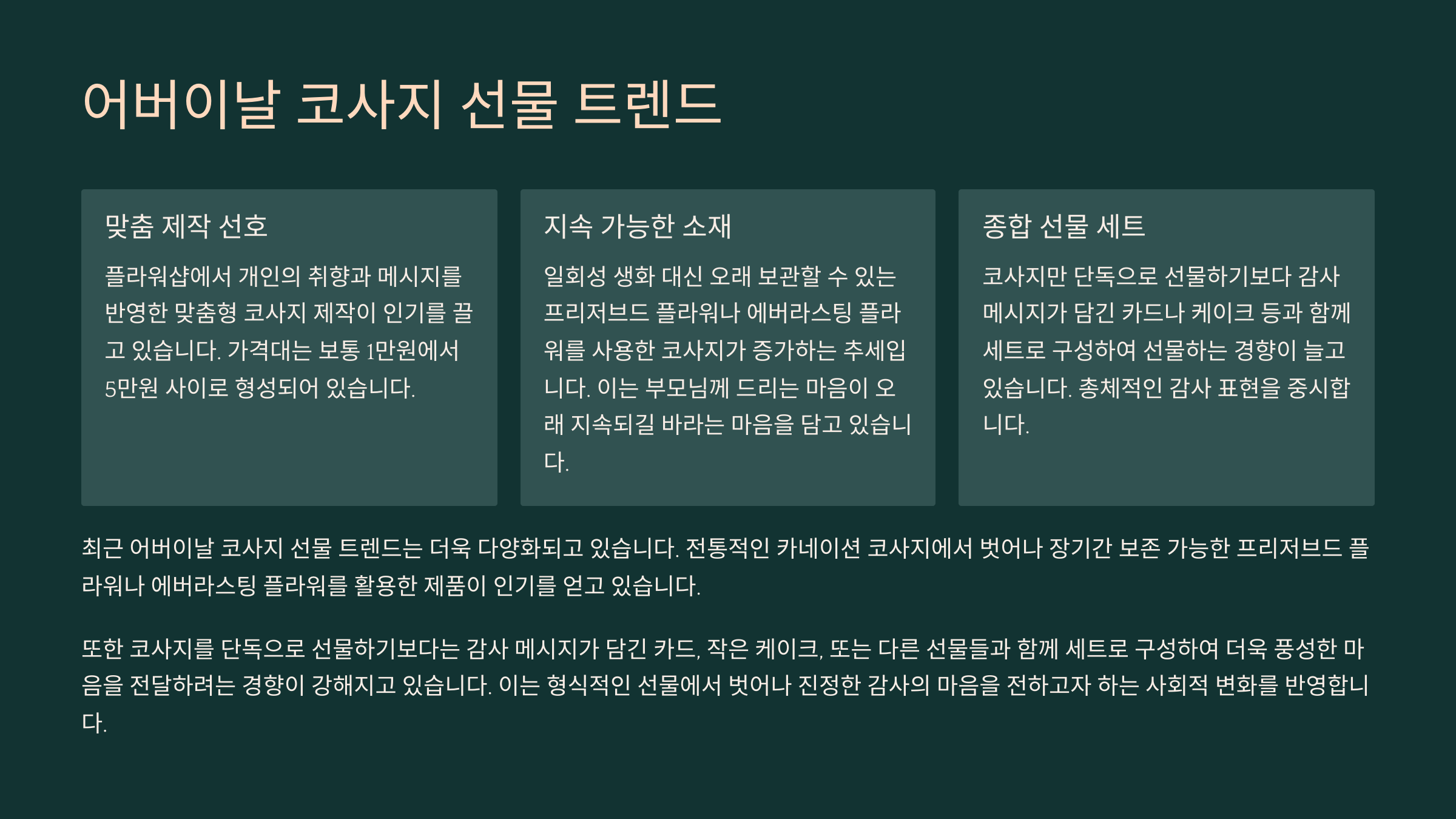 요즘 어버이날 코사지 선물은 정말 다양해졌어요. 예전에는 생화 카네이션이 주류였다면, 지금은 프리저브드 플라워나 비누꽃 코사지도 엄청 인기 있어요! 오래도록 보관할 수 있다는 점 때문에 많은 분들이 선호하고 있어요.