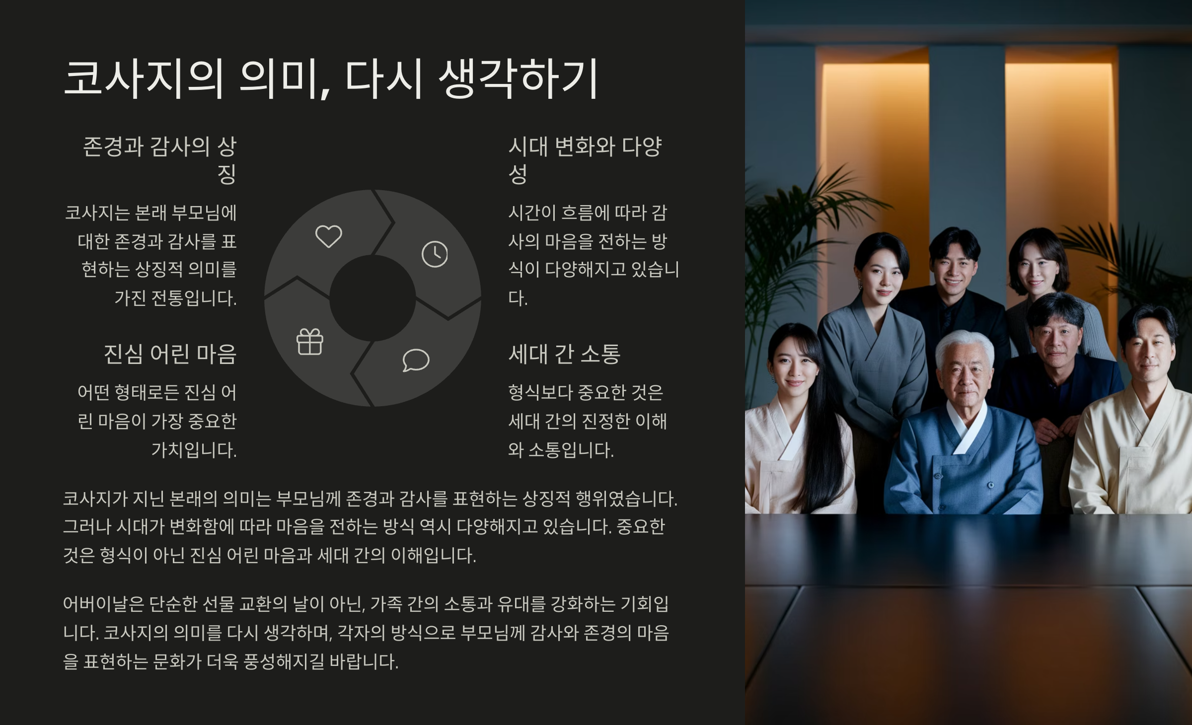 특히 젊은 세대에서는 '형식보다는 진심'을 더 중요하게 생각하는 경향이 강해요. 코사지가 예쁘긴 하지만, 진짜 부모님께 필요한 건 '정성'과 '마음'이라는 인식이 퍼지고 있어요. 시대가 변하면 문화도 조금씩 달라지는 법이죠.