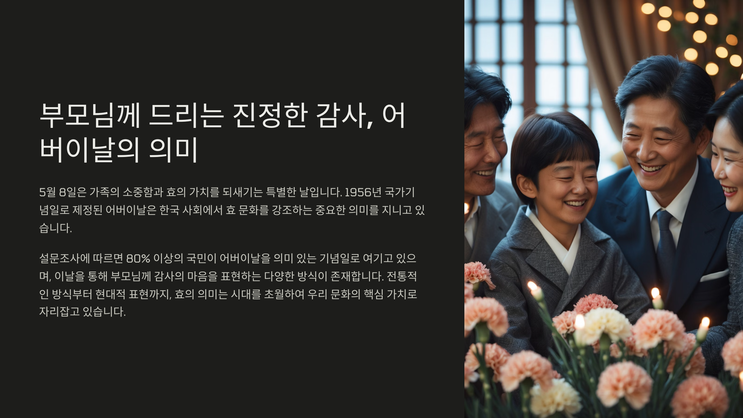 꽃 한 송이, 작은 편지, 짧은 전화 한 통이라도 부모님에게는 세상에서 가장 큰 선물이 될 수 있어요. 중요한 건 '어떻게'가 아니라 '어떤 마음으로' 준비하는지인 것 같아요.
