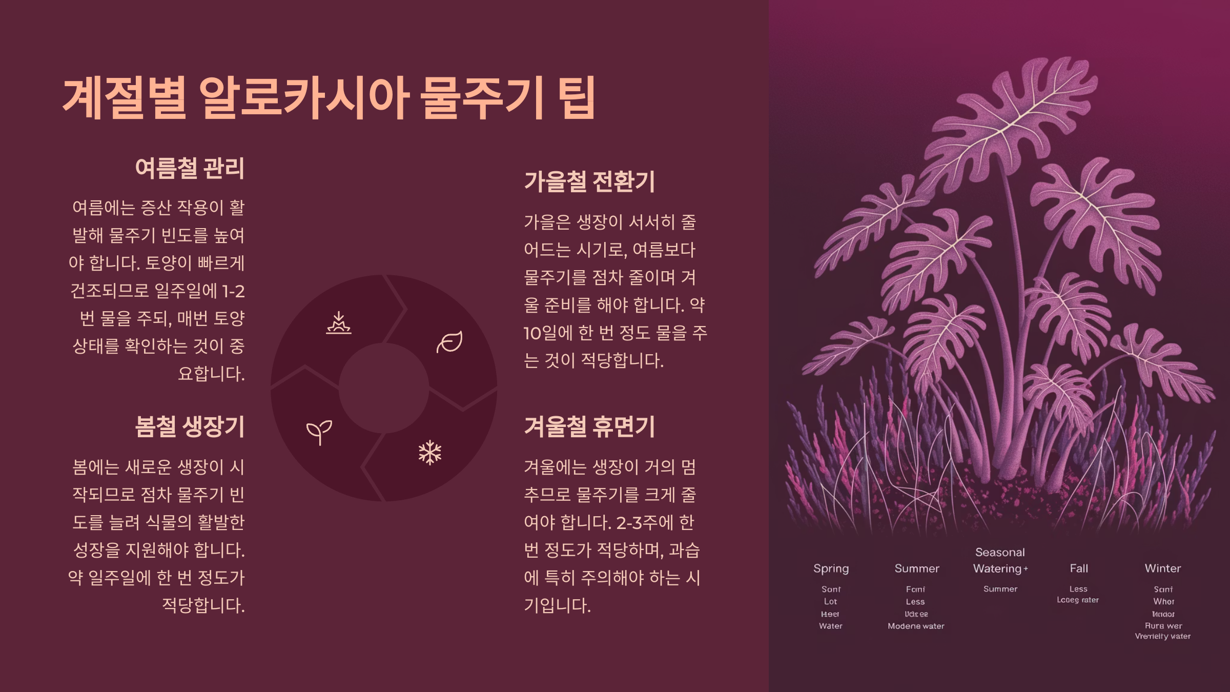 알로카시아는 계절에 따라 물주기 패턴이 확 달라져야 해요. 🌱 여름철에는 성장 속도가 빨라 물을 자주 필요로 하지만, 겨울에는 휴면기에 들어가기 때문에 물을 거의 필요로 하지 않아요. 계절별로 똑똑하게 관리하는 게 알로카시아를 오래 키우는 비결이랍니다!
