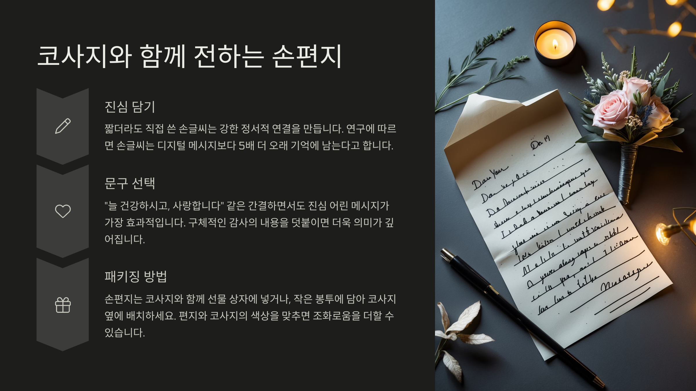손편지용 카드나 종이도 신경 써주면 좋아요. 화사한 꽃무늬 카드나 고급스러운 크림색 편지지를 고르면 코사지와 조화롭게 어우러져서 선물의 완성도를 높여준답니다.
